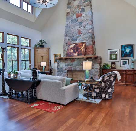 Transform a historic Girl Scout camp on Pleasant Lake into a 6,000 sq. ft. luxury private estate that preserves the property’s rustic charm while incorporating modern design, custom spaces, and sustainable, energy-efficient features. Key elements include reusing the existing stone fireplaces; a two-sided fireplace connecting the great room and master suite, a two-story great room with clerestory windows, a golf simulator room, living space over the garage accessible from the mudroom, and a grilling porch, all thoughtfully designed to enhance both function and style.